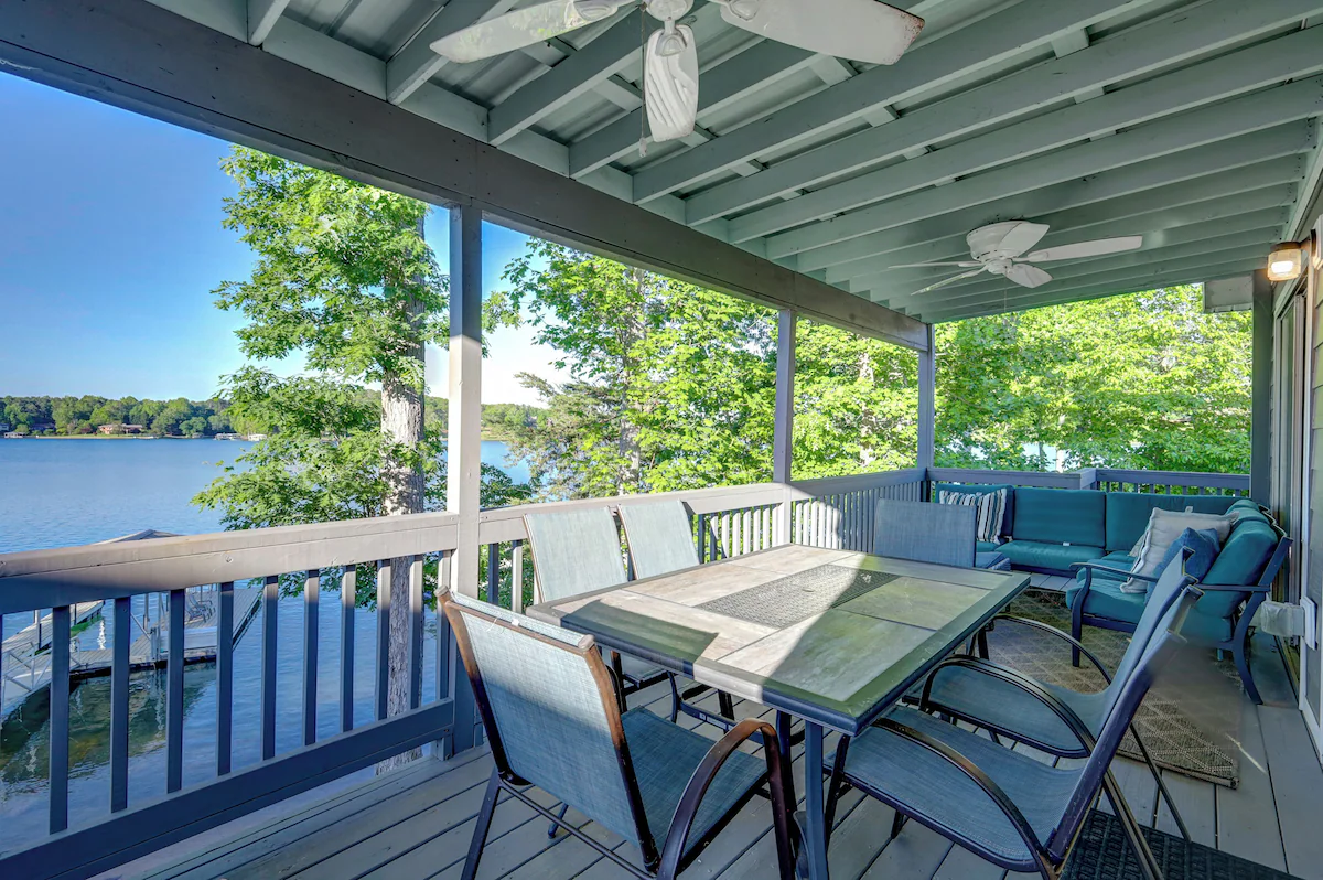 Just outside the living room is a peaceful lakefront porch extending over the entire width of the rear of the home. This porch includes a table and chairs for outdoor dining, a comfortable plush sectional with padded ottomans, incredible lake views, and everything you could possibly need for enjoying your morning coffee or relaxing with friends and family in the evening. The main level patio also features a new gas grill and outdoor table and chairs, again with beautiful views of the lake.