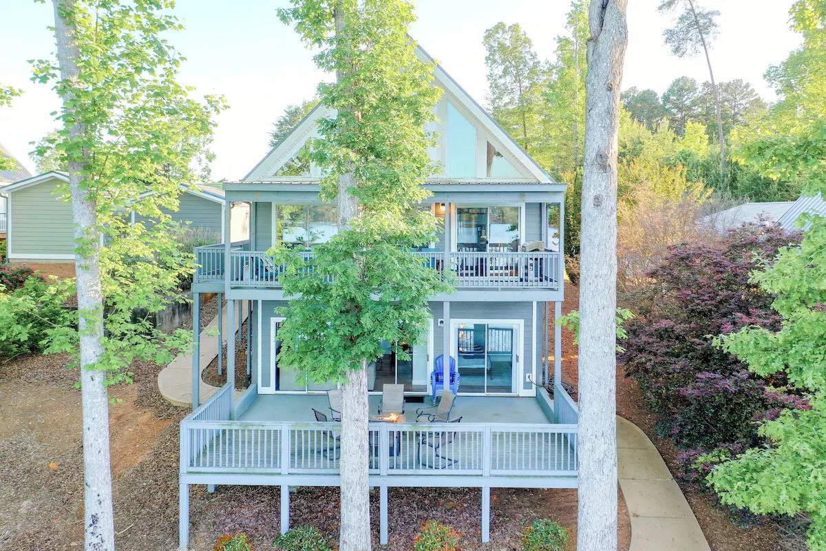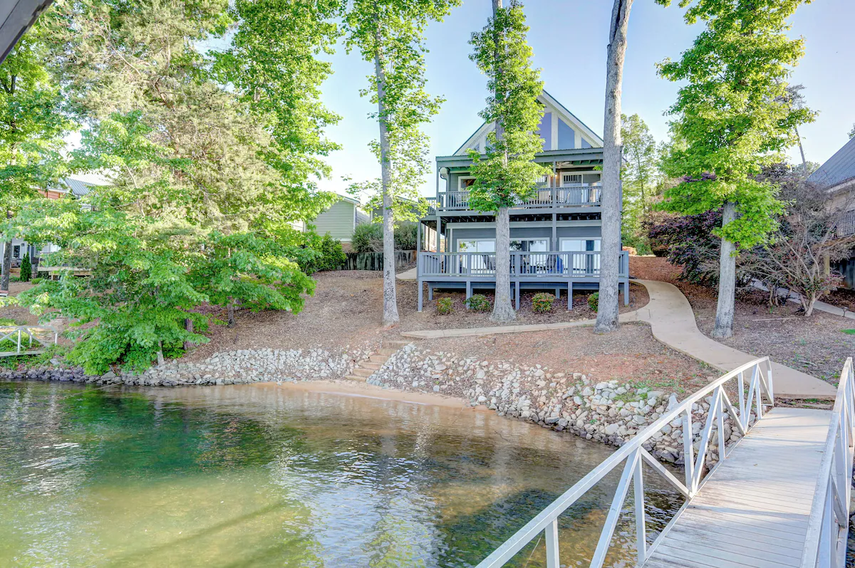 The exterior of the home is gray cement siding with fun teal exterior doors accentuating the lakeside patio and terrace outdoor living area. Just beyond the terrace is your own private sandy beach and private dock to soak in the views of pristine Lake Keowee, which is consistently ranked as one of the cleanest and most beautiful lakes in the country. Bring your boats or jet skis and dock them in the slip for the duration of your stay. The view from the dock is truly amazing, with long eastward views for amazing sunrises, westward views for breathtaking sunsets, and big water views across Lake Keowee including several undeveloped islands.